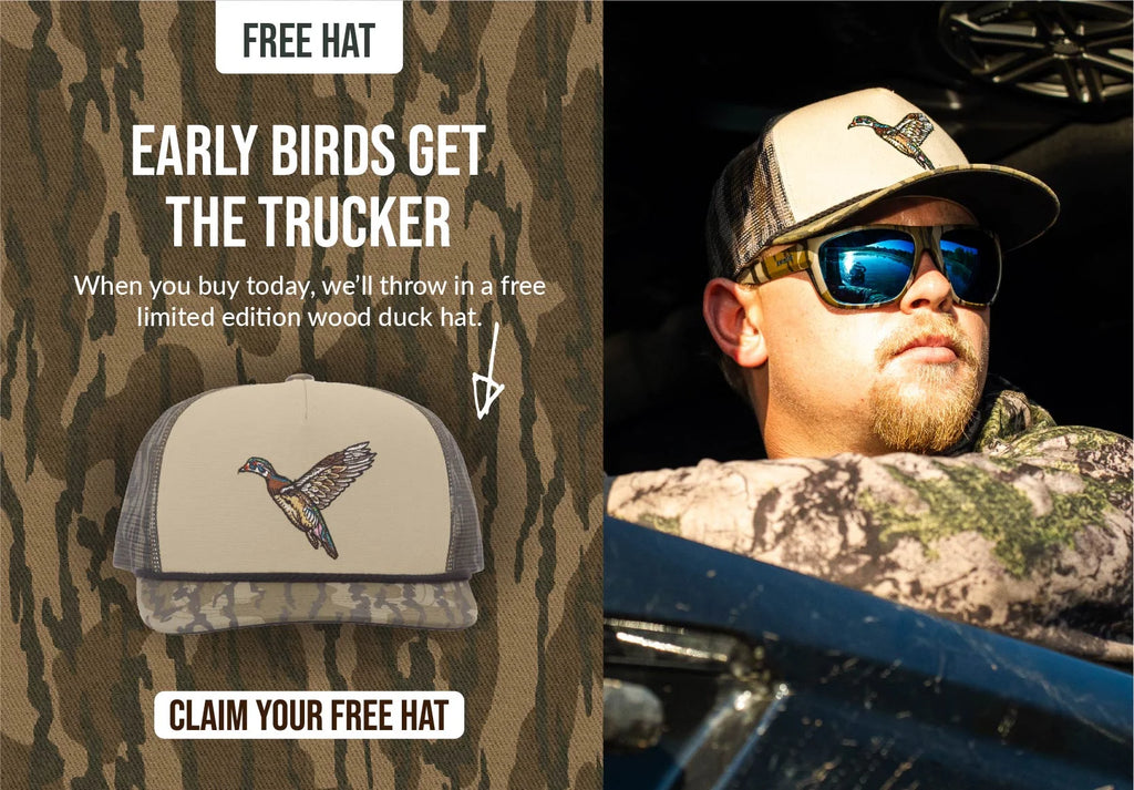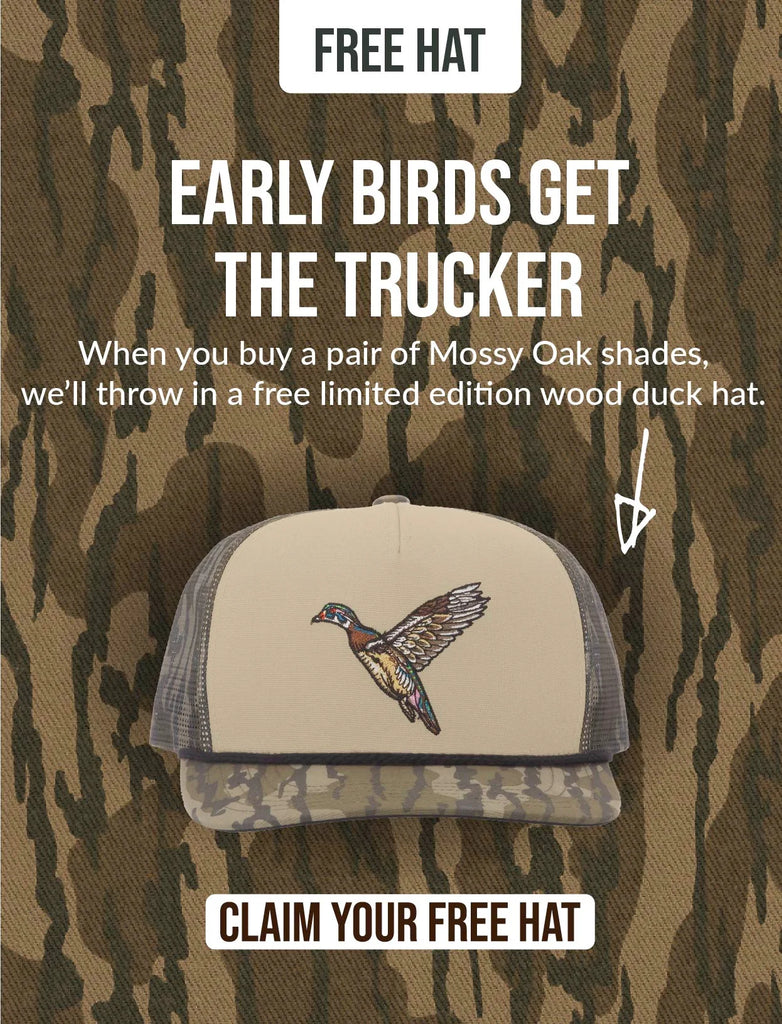 Free Limited Edition Wood Duck Hat available only with the purchase of Limited Edition Mossy Oak Sunglasses. Gift with purchase valid from October 22nd at 12:01 am EST. until November 14th at 11:59 pm EST. While supplies last.